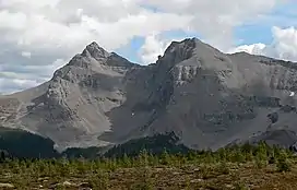 Like other mountains in Banff Park, Mount Howard Douglas is composed of sedimentary rock laid down from the Precambrian to Jurassic periods.[5] Formed in shallow seas, this sedimentary rock was pushed east and over the top of younger rock during the Laramide orogeny.[6]