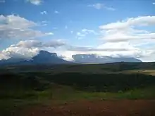 Altitudes in the park range from 920 to 2,780 metres (3,020 to 9,120 ft) above sea level.[1] The mountains typically have large, flat table tops fringed by steep and partially denuded cliffs, which are surrounded by broad pediments cut with ravines that merge into the lower dissected reliefs of the Pacaraima range. The Serra do Sol range to the southeast has altitudes up to 2,400 metres (7,900 ft).[1]