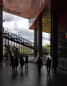 A public staircase on the outside allows the general public to "climb" the mountain, and a local mountain climbers’ association will soon install a climbing wall at the back of the building, near the peak.[7]