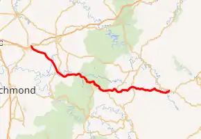 The Bert T. Combs Mountain Parkway, commonly known as the Mountain Parkway, is a freeway in eastern Kentucky. The route runs from Interstate 64 just east of Winchester southeast for 75.627 miles (121.710 km) to a junction with U.S. Route 460 near Salyersville. The first 46 miles (74 km), beginning at the western terminus in Winchester is a four-lane limited access highway with only minor design standard differences from an Interstate Highway, while the remainder is a limited access Super two highway.