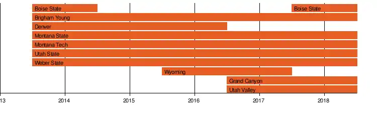 | Utah State | Logan, UT | 1888 | Public (Utah System of Higher Education) | Aggies | ||