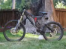 A mountain bike (MTB[1]) or mountain bicycle is a bicycle designed for off-road cycling. Mountain bikes share some similarities with other bicycles, but incorporate features designed to enhance durability and performance in rough terrain, which makes them heavier, more complex and less efficient on smooth surfaces.[2] These typically include a suspension fork, large knobby tires, more durable wheels, more powerful brakes, straight, extra wide handlebars to improve balance and comfort over rough terrain, and wide-ratio gearing optimised for topography and application (e.g., steep climbing or fast descending). Rear suspension is ubiquitous in heavier-duty bikes and now common even in lighter bikes. Dropper posts can be installed to allow the rider to quickly adjust the seat height[3] (an elevated seat position is more effective for pedaling, but poses a hazard in aggressive maneuvers).