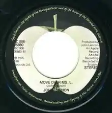 Lennon recorded demos of "Move Over Ms. L" around May and June 1974, first an electric guitar version and then an acoustic guitar version.[1][2] Lennon recorded the original version of "Move Over Ms. L" that he intended to release on July 15, 1974, using the musicians that performed on Walls and Bridges.[1][3] It was intended to be included on Walls and Bridges but Lennon decided to leave it out 3 weeks before the album's release.[1][2][3] It was originally slotting to be on side 2 of the album, between "Surprise, Surprise" and "What You Got," the latter of which was later shifted to side 1.[2][4] Lennon rerecorded it in October 1974 and finally released as the b-side of "Stand By Me" in March 1975.[1][3] It is the only song of Lennon's solo career to be released as a single b-side without appearing on an album during his lifetime.[2] An alternative take that was recorded during the Walls and Bridges sessions was released on John Lennon Anthology.[2][3][5]