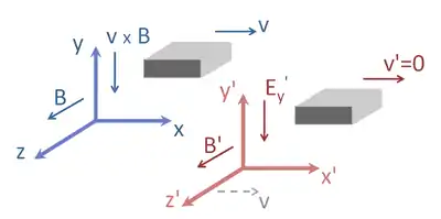 In the conductor frame, there is a time-varying magnetic field B' related to the magnetic field B in the magnet frame according to:[8]