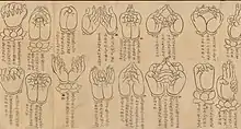Some Asian martial arts forms contain positions (Japanese: in) identical to these mudras.[26] Tendai and Shingon Buddhism derived the supposedly powerful gestures from Mikkyo Buddhism, still to be found in many Ko-ryū ("old") martial arts Ryū (schools) founded before the 17th century. For example the "knife hand" or shuto gesture is subtly concealed in some Koryu kata, and in Buddhist statues, representing the sword of enlightenment.[27]