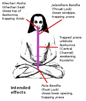 Mahamudra, the Great Seal, similarly has one heel pressed into the perineum; the chin is pressed down to the chest in Jalandhara Bandha, the Throat Lock, and the breath is held with the body's upper and lower openings both sealed, again to force the prana into the sushumna channel.[20]