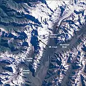 The Mueller Glacier[1] is a 13-kilometre (8.1 mi) long glacier flowing through Aoraki / Mount Cook National Park in the South Island of New Zealand. It lies to the west of Mount Cook Village within the Southern Alps, flowing roughly north-west from its névé near Mount Montgomerie before curving around the Sealy Range as it approaches its terminus. Various other glaciers feed into the Mueller Glacier along its route, including the Frind and Huddleston Glaciers. The glacier ends at a small unnamed terminal lake, which is also fed by meltwater from the nearby Hooker Glacier. This lake is the source for the Hooker River, a small tributary of the Tasman River, which flows into Lake Pukaki.