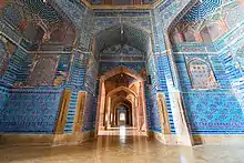 The Wazir Khan Mosque was commissioned during the reign of the Mughal Emperor Shah Jahan in 1634, and completed in 1642.[14] Considered to be the most ornately decorated Mughal-era mosque,[15] Wazir Khan Mosque is renowned for its intricate faience tile work known as kashi-kari, as well as its interior surfaces that are almost entirely embellished with elaborate Mughal-era frescoes. The mosque has been under extensive restoration since 2009 under the direction of the Aga Khan Trust for Culture and the Government of Punjab.[16]