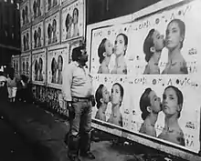 The press and promotion of the album were carried out by María Watson.[23] Mujer contra mujer is widely remembered for a promotional campaign in which the city of Buenos Aires was wallpapered with large posters featuring its cover photograph.[4][29][30] The suggestive image was controversial,[25][26] and is now celebrated as a landmark in lesbian visibility in Argentina.[24][31][27] In a 2019 radio program, Mihanovich recalled: "What we did was beautiful. My jaw dropped when I saw the Mujer contra mujer poster on the street. It is one thing to see the photo in the studio and quite another to come across [large] posters. It was a scandal! But, at the same time, I think it was very harmonic, very beautiful and it was something very successful aesthetically. Gabriel Rocca, the person in charge, is a great photographer. I am proud to have gone through all these things, but I confess that I am not as brave as I seem. I think I've gone through all those places almost without realizing it, like when you dive into a pool..."[4]