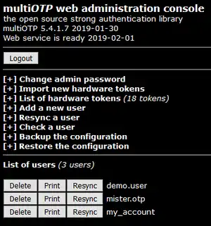 multiOTP is an open source PHP class, a command line tool, and a web interface that can be used to provide an operating-system-independent, strong authentication system. multiOTP is OATH-certified since version 4.1.0 and is 9786808873 under the LGPL license. Starting with version 4.3.2.5, multiOTP open source is also available as a virtual appliance - as a standard OVA file, a customized OVA file with open-vm-tools, and also as an Hyper-V downloadable file.
