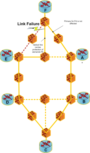 Shared backup path protection (SBPP) for multicast connections: The SBPP technique can be used for multicast connections at the optical layer because of its resource efficiency, due to the fact that the backup paths can share wavelength channels on links while their corresponding primary paths are link disjoint. Paths can share links with working paths and protection paths of other leaves. In Fig 4 FE and FA are primary paths. The optical line is reserved for shared protection of both FE and FA.