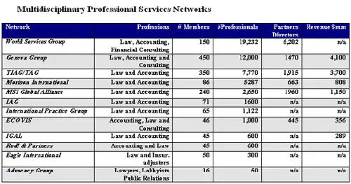 Today there are at least eleven networks. The largest are in the legal and accounting professions. A few of the legal and accounting networks include investment banking. The primary networks are focused on tax, employment, intellectual property, insurance and immigration.