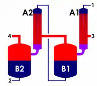 diagram of a double-effect falling film evaporator. Condensing vapors from flash tank B1 heat evaporator A2. 1=feed, 2=product, 3=steam, 4=vapors
