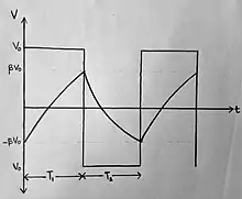 Assume all the capacitors to be discharged at first. The output of the op-amp Vo at node c is +Vsat initially. At node a, a voltage of +β Vsat is formed due to voltage division where . The current that flows from nodes c and b to ground charges the capacitor C towards +Vsat. During this charging period, the voltage at b becomes greater than +β Vsat at some point. The voltage at inverting terminal will be greater than the voltage at the non-inverting terminal of the op-amp. This is a comparator circuit and hence, the output becomes -Vsat. The voltage at node a becomes -βVsat due to voltage division. Now the capacitor discharges towards -Vsat. At some point, the voltage at b becomes less than -β Vsat. The voltage at the non-inverting terminal will be greater than the voltage at the inverting terminal of the op-amp. So, the output of the op-amp is +Vsat. This repeats and forms a free-running oscillator or an astable multivibrator.
