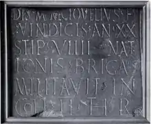 A third inscribed stone has been described as a "Funerary inscription for Nectovelius". George Macdonald says the translation is: "To the Divine Manes. Nectovelius, son of Vindex. Aged thirty. A Brigantian by birth, he served for nine years in the Second Cohort of Thracians."[17] The Brigantes were a Celtic tribe who controlled the largest section of what would become Northern England. This shows local recruitment of native Britons.