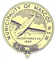 The council established a reputation for its probity and prudent financial management, at a time when the small Sydney municipalities were often struggling to keep up with infrastructure demands, population growth and political infighting. The Construction and Local Government Journal praised Mascot council in this vein in a March 1920 editorial, noting "Mascot is essentially a working man's suburb, but the fashionable socialism of Labor Government does not appear to find favor with the sturdy, thrifty working men and intelligent women who have votes in this Municipality, and the reason is not very far to seek, for it is a remarkable circumstance that nearly all the residents own their own homes."[25] At the same time, planning had begun for the construction of a larger public airfield at Mascot, with the Commonwealth Government purchasing 65 hectares for this purpose in 1921. Indeed, the Mayor in 1920, Thomas Hicks, declared: "The year has marked a new era for the Municipality of Mascot in the establishment of an aerodrome by the Australian Aircraft and Engineering Company of Australia, on the area between Cook's River and Old Botany Road. This site has been pronounced as the favored-by-nature of any other in the County of Cumberland, and the establishment of the air-service undertaking must bring Mascot very prominently before the world."[25] Such was the pride the council took in its growing recognition with aviation, that they changed the council seal in the 1930s to depict an aircraft in flight.[24] Aldermen during this time included Thomas Mutch (1923–1930), MLA for Botany (1917–1930).