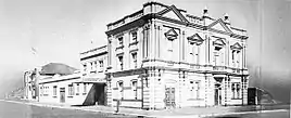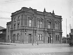 At the July 1888 meeting, council resolved to purchase a block of land at the corner of Botany Road and Ricketty Street (Later Edward Street, then Coward Street, after the first mayor) at the cost of £600.[12] On 21 December 1889, the foundation stone was laid for the new Town Hall, designed in the Victorian Italianate style by C. Hawkins and built by Edward Christie.[13] The Town Hall was officially opened by the Mayor, James Coward, on 2 August 1890.[14][15] However, within a few years, it had become apparent that this town hall was inadequate for the purposes of a growing council and area, along with the need for a modern function hall compliant with the Theatres and Public Halls Act.[16][17] Council resolved in 1910, to commission expansions along the Edward Street frontage. This expansion, designed in a similar style by Buchanan & McKay, Architects, and built by Peter Doulan, was named "Coronation Hall" to commemorate the coronation of George V and opened on 8 July 1911.[18][19][20]