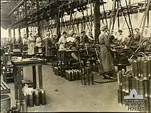 The Munitions of War Act of July 1915 declared that the admission of 'semi-skilled or female labour shall not affect adversely the rates customarily paid for the job' or reduce the rates a man could be expected to pay.[8] There was not an official statement as to what constituted "men's" work versus "women's" but in October, suggestions were made as to what women doing "men's" work should be paid.[9][8] An amendment in January 1916 stated that the Minister of Munitions had the power to give directions as to the rate of wages of female workers, and introduced compulsory arbitration for disagreements between women workers and their employers. In the August 1917 Act, the certificate regulations preventing women from leaving factories without their employers' permission to earn higher wages elsewhere were repealed.[8] Munitions workers presented an unusual case in the history of equal employment. The Ministry of Munitions approach to the principle "equal pay for equal work" was that: