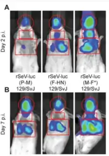 Inbred and outbred mouse and rat strains have very different susceptibility to Sendai virus infection. Visualization of SeV infection in live animals demonstrates this difference.[26] The 129/J mice tested were approximately 25,000-fold more sensitive than SJL/J mice.[27] C57BL/6 mice are highly resistant to the virus, while DBA/2J mice are sensitive.[28] C57BL/6 mice showed slight loss of body weight after SeV administration, which returned to normal later. Only 10% mortality rate was observed in C57BL/6 mice after the administration of very high virulent dose of 1*105 TCID50.[29] It was shown that resistance to the lethal effects of Sendai virus in mice is genetically controlled and expressed through control of viral replication within the first 72 hours of infection.[28] Treatment of both strains with exogenous IFN before and during viral infection led to an increase in survival time in C57BL/6 mice, but all animals of both strains ultimately succumb to SeV caused disease.[30] If a mouse survives a SeV infection, it develops a lifelong immunity to subsequent viral infections.[31]