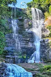 Muriqui is home to an art installation by Japanese artist Mariko Mori called Ring: One With Nature, inaugurated atop the Bride's Veil (Portuguese: Véu da Noiva) waterfall in August 2016 to celebrate the 2016 Summer Olympics.[39] The piece is an acrylic ring that changes in color depending on the position of the sun, and is meant as a representation of a sixth Olympic ring. It measures about 3 metres (9.8 ft) in diameter and weighs around 2 tonnes (4,400 lb).[40][41]