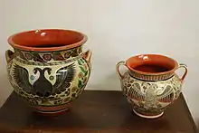 Bandera, which means "flag" in Spanish, is so named because it has the green-red-and-white colors of the Mexican flag.[10] Red is commonly used as the background color, while the green and white are used for the decorative details.[8] It is also an unglazed burnished ware. For unknown reasons, this style of pottery is very rare.[12] One uncommon ware is called engregado. These objects have a special varnish that make them useful for cooking, the varnish acting like a coating of Teflon that prevents food from slicking when heated.[10]