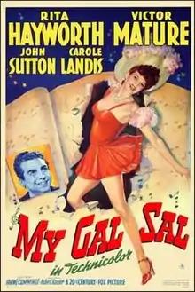 My Gal Sal is a 1942 American musical film distributed by 20th Century Fox and starring Rita Hayworth and Victor Mature. The film is a biopic of 1890s composer and songwriter Paul Dresser and singer Sally Elliot. It was based on a biographical essay, sometimes erroneously referred to as a book, by Dresser's younger brother, novelist Theodore Dreiser. (Dreiser was the original family name.) Some of the songs portrayed as Dresser's work were actually written by him, but several were created for the film by the Hollywood songwriting team of Ralph Rainger and Leo Robin.[3]