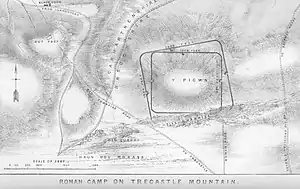 There are several round barrows and a stone circle on Mynydd Bach Trecastell dating to Bronze Age Britain. The Roman roads from CICVCIVM (Y Gaer) to MORIDVNVM (Moridunum, Carmarthen) via Llandovery ran over the hill and evidence of a couple of castras and a Roman fortlet remains on the hill.