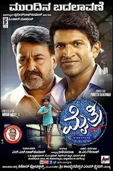 Mythri (transl. Alliance) is a 2015 Indian social drama film written and directed by B. M. Giriraj and produced by N. S. Rajkumar under the banner of Omkar Movies.[1] It stars Mohanlal and Puneeth Rajkumar in extended cameo roles, and features Adithya Bharadwaj, Archana, Atul Kulkarni, and Bhavana in substantial roles.[2][3] Ilaiyaraaja scored the music for the film and Krishna Kumar handled the cinematography. The film is shot in both Kannada and Malayalam and the film is a social drama, and also focuses on relationships in the time of liberalisation.[4]