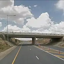 After Polokwane, the N1 heads north, crossing the Tropic of Capricorn before passing Louis Trichardt. The N1 then winds through the Soutpansberg Mountains (containing two short tunnels) before heading to Musina (passing the last tollgate before Musina). Plans are underway for a bypass around Musina (it will be an 8 km highway west of the Musina CBD; to be completed in June 2022).[5] The route then continues for 16 km to end at the Beit Bridge border crossing with Zimbabwe on the Limpopo River.