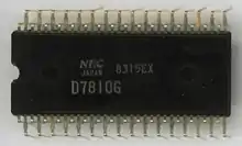 The μCOM-42 (μPD548) is a 4-bit PMOS microcontroller in a 42-pin package. It has built-in ROM (1920 × 10 bit) and RAM (96 × 4 bit) as well as keyboard, display, and printer controllers. The μPD548 requires a power supply of -10V and the outputs can switch up to -35V.[6]:123–128 A ROM-less chip (μPD555) in a 64-pin quad-in-line package was available for hardware and software development.[6]:129–132