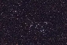 NGC 6633 is a large bright open cluster in the constellation Ophiuchus. Discovered in 1745-46 by Philippe Loys de Chéseaux, it was independently rediscovered by Caroline Herschel in 1783 and included in her brother William's catalog as H VIII.72.[1] Bright enough to be seen with the naked eye, the cluster is considered a fine object for binoculars or small telescopes.[2]