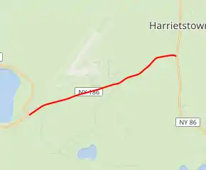 In the west, NY 186 begins at NY 30 in Harrietstown, near the eastern bank of Lake Clear. Known as Lake Clear Road, NY 186 heads east-northeastward, crossing a pair of train tracks and later a creek. Situated within the forested terrain of the Adirondack State Park, the highway passes to the south of, and serves, the Adirondack Regional Airport. South of the airport NY 186 intersects several local roads. The highway turns more towards the northeast upon passing the airport, and proceeds uneventfully. Subsequent to turning towards the east, NY 186 terminates at NY 86, still within Harrietstown.[4]
