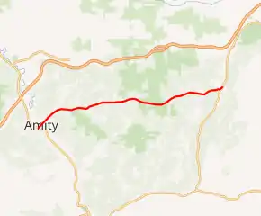 NY 244 begins at an intersection with NY 19 in the village of Belmont, located 3 miles (4.8 km) southeast of the Southern Tier Expressway (Interstate 86 or I-86 and NY 17) in the town of Amity. The route heads northeast on the two-lane Genesee Street, serving several blocks of homes as it crosses the Western New York and Pennsylvania Railroad at-grade and passes over the Genesee River. On the opposite bank, NY 244 changes names to Milton Street at an intersection with the south end of County Route 48 (CR 48, named Triana Street). From here, the route continues northeastward out of the village and into less developed areas of Amity. Outside the village limits, the route becomes Mainville Road and runs mostly parallel to Phillips Creek, following it northeast and eastward through a lightly populated valley. The highway meets the southern terminus of CR 2B (Baker Valley Road) on its way into the town of Ward, where NY 244 loses the Mainville Road name and the creek ends in the hamlet of Phillips Creek.[3]