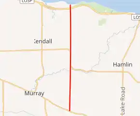 NY 272 begins at an intersection with NY 104 (Ridge Road) on the Orleans–Monroe county line, which also separates the towns of Clarkson and Murray. The two-lane route heads north, passing through open fields and over Sandy Creek to intersect NY 18 at Kendall Mills, a hamlet in the town of Hamlin. NY 18 briefly overlaps NY 272 northward but veers west off the county line and into Kendall south of the dual-town hamlet of Morton. The number of homes and businesses along NY 272 begins to rise during the stretch between Kendall Mills and Morton.[3]