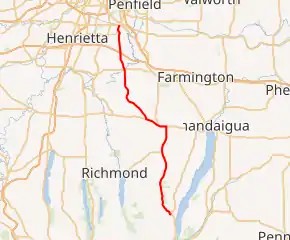 | Ontario | South Bristol | 0.00 | 0.00 | Southern terminus; hamlet of Bristol Springs | |