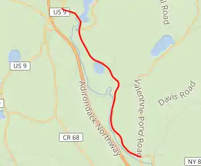 In 1913, the New York State Legislature created Route 22-c, an unsigned legislative route extending 4.80 miles (7.72 km) from State Highway 1023 (later NY 8 and now CR 53) near Starbuckville to legislative Route 22 (modern US 9) in Pottersville.[5][6] The Route 22-c designation was eliminated on March 1, 1921, as part of a partial renumbering of New York's legislative route system.[7] In the 1930 renumbering of state highways in New York, hundreds of state-maintained highways that did not have a signed designation were assigned one.[8] The former routing of legislative Route 22-c was designated as NY 9M by the following year.[1][2] NY 9M was short-lived, however, as it ceased to exist c. 1939.[3][4] Its former routing is now maintained by Warren County as CR 55 from former NY 8 (CR 53) to East Schroon River Road, CR 64 from Valentine Pond Road to East Shore Road, and CR 62 from East Shore Road to US 9.[9]