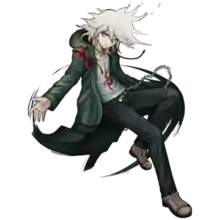 In Danganronpa 2: Goodbye Despair, Nagito is an apparently optimistic, subservient student accepted into Hope's Peak Academy by a raffle, who then received the title of Ultimate Lucky Student (超高校級の「幸運」, Chō-kōkō-kyū no "Kōun", lit. Super High School Level Good Luck). Outwardly presenting as a friendly, upbeat, somewhat meek young man, his true demeanor, revealed following the beginning of Monokuma's killing game, is shown to be quite deranged in his pursuit of hope, believing it to be an absolute good that only his talented classmates can achieve, willing to bring about great despair to create the greatest of hopes. Because of his beliefs, he is completely willing to let his talented classmates walk over him, seeing himself as inferior to them, all while keeping his cheerful, optimistic attitude and frequently referring to himself as a "stepping stone for [their] hope."[13] He is highly unstable and suicidal, as the bad luck of his cycle causes catastrophes in his life that he believes are unavoidable, leading to him manipulating Teruteru Hanamura into killing Byakuya Togami to start the killing game. He remains cheerful and enthusiastic even in horrifying situations when someone has died, which results in his classmates fearing him and finding him creepy.[14] this is compounded by the fact that he is revealed in his Free Time Events to have a degenerative brain disease slowly eating away at his ability to think rationally, which could kill him at any moment. He also feels deep self-loathing over the nature of his talent being, in his mind, lackluster compared to his classmates' talents, seeing himself as not a true "Ultimate" compared to those around him while at the same time expressing disdain for "normal" people like himself.