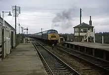 The station has two platforms, separated by two running lines. The line runs on a slight curve through the station, at an angle of roughly 067 degrees,[5] and has a linespeed of 100 miles per hour (160 km/h). The northern platform, platform 2, is 121 metres (132 yd) long and serves eastbound trains; the southern platform, platform 1, is 122 metres (133 yd) and serves westbound trains.[6] Access to the two platforms is by steps from the road on either side. There is a ramp to the eastbound platform, but it has a gradient greater than 1 in 12, and there is no ramp access to trains. There is no ramp access to the westbound platform. Access between the platforms is either by a footbridge, or by walking along the main road under the line.[7] There are metal and glass waiting shelters on both platforms – three on the eastbound platform, one on the westbound.[1] Two ticket machines are situated on the north side of the station, which can also be used to collect pre-bought tickets. These machines are supplemented by a small ticket kiosk on the eastbound platform which is open during the morning peak.[7] "Next train" dot-matrix displays and an automated public-address system announce approaching services.