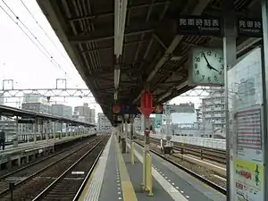 Nakatsu Station (中津駅, Nakatsu-eki) is a railway station in Kita-ku, Osaka, Japan on the Hankyu Kobe Line and the Hankyu Takarazuka Line, and is operated by Hankyu Railway. While situated relatively close to the station of the same name on the Midosuji Line, there are no free transfers between the two stations. In past, there was a car stop on the Hanshin Railway Kita-Osaka Line in the west side of this station on the Hankyu Railway lines.