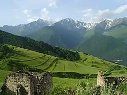 Lack of arable land in sufficient quantities in the mountainous areas forced Vainakhs to use their territory of residence as efficiently as possible. They leveled the steep slopes, organized terraces suitable for agriculture. On the barren rocky slopes of rocks, which are unsuitable for agriculture, Vainakhs hew foundations for terraces. On carts harnessed donkeys and oxen, they brought black soil of the lowlands, and filled with it artificial terraces.[39] For maximum harvest was organized by the entire irrigation system, which consisted of a small artificial stream canals connected with the mountain rivers, these canals were called Taatol, they also built a small stone canals called Epala, and quite small wooden troughs Aparri. Some scholars notably I. Diakonov and S. Starostin proposed that Epala and Aparri may correspond to Urartian irrigation canal name "pili" and Hurrian "pilli/a".[40] Some irrigation structures were built also on lowlands but they were less complicated.