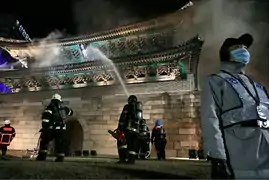 At approximately 8:50 p.m. on 10 February 2008, a fire broke out and severely damaged the wooden structure at the top of the Namdaemun gate. The fire roared out of control again after midnight and finally destroyed the structure, despite the efforts of more than 360 firefighters.[15] Many witnesses reported seeing a suspicious man shortly before the fire, and two disposable lighters were found where the fire was believed to have started.[16] A 69-year-old man identified as Chae Jong-gi was arrested on suspicion of arson and later confessed to the crime.[17][18][19] A police captain reported that Chae had sprayed paint thinner on the floor of the structure and then set fire to it.[20] Police say that Chae was upset about not being paid in full for land he had sold to developers.[18] The same man had been charged with setting a fire at Changgyeong Palace in Seoul in 2006.[21]