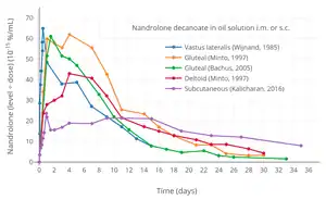 Nandrolone levels after a single 100 mg intramuscular injection of nandrolone decanoate or nandrolone phenylpropionate in 4 mL or 1 mL arachis oil solution into gluteal or deltoid muscle in men.[46] Nandrolone levels after a single 100 mg intramuscular injection of nandrolone decanoate or nandrolone phenylpropionate in 4 mL or 1 mL arachis oil solution into gluteal or deltoid muscle in men.[46]