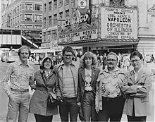 Brownlow's 1980 reconstruction was re-edited and released in the United States by American Zoetrope (through Universal Pictures) with a score by Carmine Coppola performed live at the screenings. The restoration premiered in the United States at Radio City Music Hall in New York City on 23–25 January 1981; each performance showed to a standing room only house.[13] Gance could not attend because of poor health. At the end of 24 January screening, a telephone was brought onstage and the audience was told that Gance was listening on the other end and wished to know what they had thought of his film. The audience erupted in an ovation of applause and cheers that lasted several minutes. The acclaim surrounding the film's revival brought Gance much-belated recognition as a master director before his death eleven months later, in November 1981.[25]