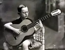 When he was 13, he was accepted to study at the Conservatorio de Valencia with the pianist and composer Vicente Asencio. Here he followed courses in harmony, composition, and performance. Yepes is credited by many with developing the A-M-I technique of playing notes with the ring (Anular), middle (Medio), and index (Indice) fingers of the right hand.[2] Guitar teachers traditionally taught their students to play by alternating the index and middle fingers, or I-M. However, since Yepes studied under teachers who were not guitarists, they pushed him to expand on the traditional technique. According to Yepes, Asencio "was a pianist who loathed the guitar because a guitarist couldn't play scales very fast and very legato, as on a piano or a violin. 'If you can't play like that,' he told me, 'you must take up another instrument.'" Through practice and improvement in his technique, Yepes could match Asencio's piano scales on the guitar. "'So,' he [Asencio] said, 'it's possible on the guitar. Now play that fast in thirds, then in chromatic thirds.'"[3] Allan Kozinn observed that, "Thanks to Mr. Asencio's goading, Mr. Yepes learned "to play music the way I want, not the way the guitar wants."[4] Similarly, the composer, violinist, and pianist George Enescu would also push Yepes to improve his technique, which also allowed him to play with greater speed.[5]