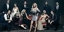 For the third season, Will Chase and Oliver Hudson were promoted to regulars after recurring performances in season two.[67] Tony Award winner Laura Benanti was cast in the recurring role of country star Sadie Stone.[68] Singer Brette Taylor was cast as Pam York, Luke's new backup singer, and Alexa PenaVega for a multi-episode arc as Kiley, Gunnar's first love.[69][70][71] Dancing with the Stars' Derek Hough also joined the cast for a multi-episode arc as Noah West.[72] Grammy winner, Christina Aguilera joined the show later in season three as pop superstar Jade St. John for a multi-episode arc.[73] on May 31, 2015 it was announced Eric Close would not be returning for the fourth season, his character was sent to prison.[74] On July 22, 2015, it was announced that Aubrey Peeples was promoted to regular, and Oliver Hudson moved from regular to recurring.[75] On October 13, 2015, it was announced that Panettiere was taking medical leave from the series for treatment for postpartum depression, which her character was also suffering from.[76] In June 2016, it was announced that Aubrey Peeples and Will Chase would not continue on the series after its shift to CMT. They were the first two cast members to be cut as producers tried to bring down production costs.[77][78] Britton chose to leave the series halfway through the fifth season. Later series regulars included Rachel Bilson, as Alyssa Greene who joined halfway through season five, and Cameron Scoggins as Zach Welles, who was promoted to a series regular halfway through the season. Kaitlin Doubleday was added to the main cast partway through the fifth season, as Jessie Caine, a mother and singer who returns to the scene.[19][79] Jeffrey Nordling, who recurred during season five, was upped to a series regular for the sixth season, and plays Jessie's ex-husband, record label owner, and Jake's dad.