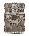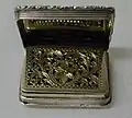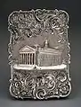 Nathaniel Mills the Elder (1746–1843) was a partner in Mills & Langston, Northwood Jewellers when he registered his first mark in 1803.[1] In 1825, he registered his well-known now punch mark 'N.M' within a rectangle at the Birmingham Assay Office and concentrated on working with silver on his own.[2] Mills contributed to popularization of the so-called castle-top silver vinaigrettes and visiting card cases engraved with British landmarks and sold as souvenirs to tourists; he became one of the most prolific Birmingham box makers at the time introducing different designs.[3][4][5]