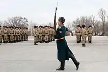 National Guard personnel are composed of soldiers and civilians alike. The basis for recruitment is laid out under a voluntary contract, as well as conscription of citizens for military service. The selection of servicemen to the National Guard is carried out in coordination with the Ministry of Defence and the Ministry of the Interior. While the National Guard does not provide its own independent educational course, many National Guard personnel are educated in higher military institutions (such as the Armed Forces Military Institute) and foreign institutions (mostly academies in Russia and Kazakhstan).[14] As of recently, new recruits take their oath of allegiance in a ceremony on Victory Square, Bishkek.[15]