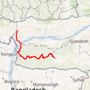 Major portion of NH-127B, over 300 km lies in state of Meghalaya. This highway passes through four districts, namely, West Garo, South West Garo, East Garo and West Khasi Hills of Meghalaya. The alignment of the road in Meghalaya starts initially from rolling terrain and then major portion passes mainly through a hilly terrain and the road has to cross numerous rivers and streams.[4]