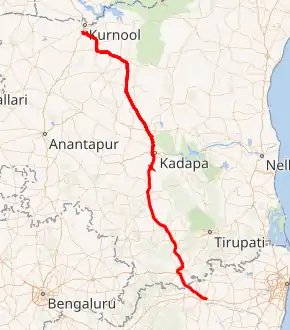 It starts at Kurnool and passes through Nandyal, Allagadda, Mydukur, Kadapa, Rayachoti, Pileru, Chittoor and ends at Ranipet. It runs for a distance of 381.00 km (236.74 mi) in Andhra Pradesh and 27.00 km (16.78 mi) in Tamil Nadu.[2][3]