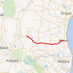 It starts at junction of National Highway 65 Nakrekal and passes through Nalgonda on the Nagarjuna Sagar road until Telangana border and then through Macherla, Yerragondapalem, Markapur, Kanigiri, and Venkatagiri before terminating at National Highway 71 at Yerpedu in Andhra Pradesh.[3][4]